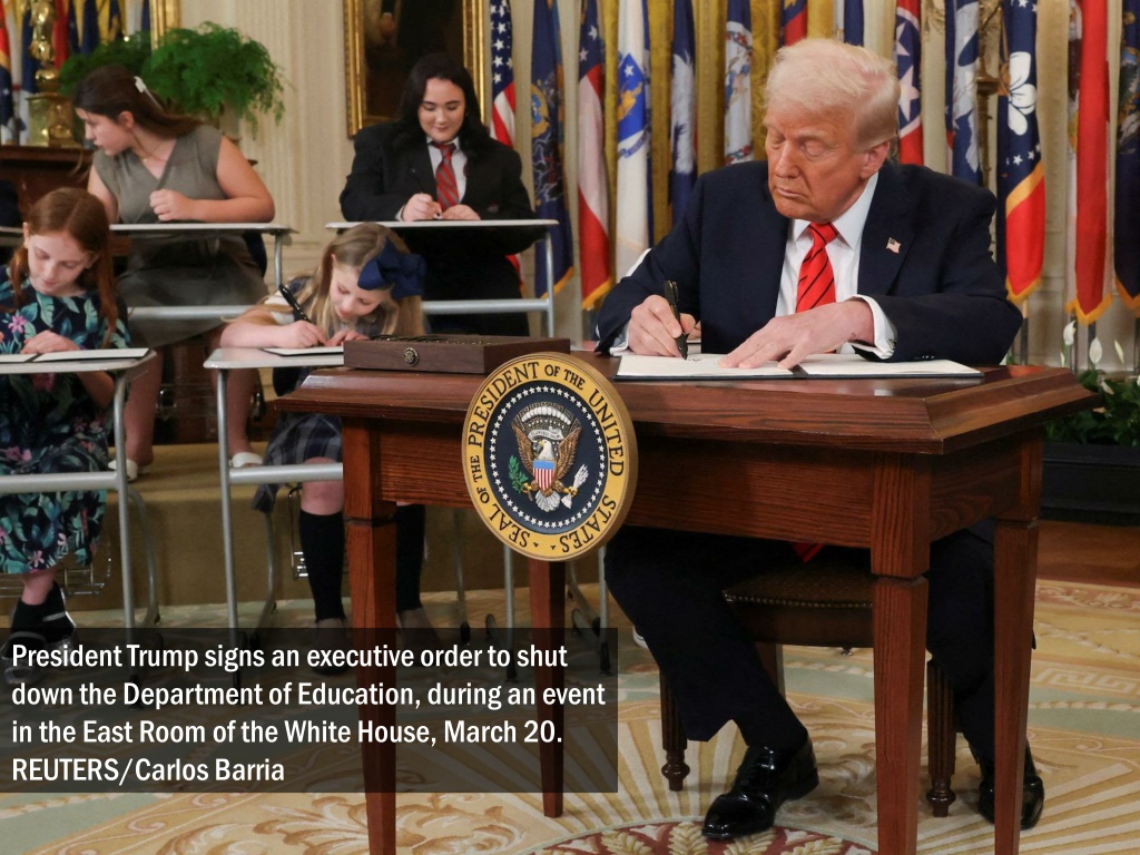 President Trump signs an executive order to shut down the Department of Education, during an event in the East Room of the White House, March 20. REUTERS/Carlos Barria
