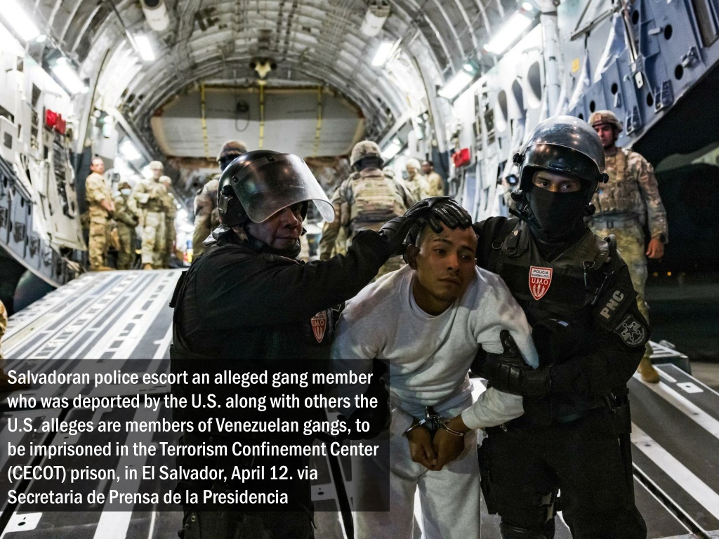 Salvadoran police escort an alleged gang member who was deported by the U.S. along with others the U.S. alleges are members of Venezuelan gangs, to be imprisoned in the Terrorism Confinement Center (CECOT) prison, in El Salvador, April 12. via Secretaria de Prensa de la Presidencia