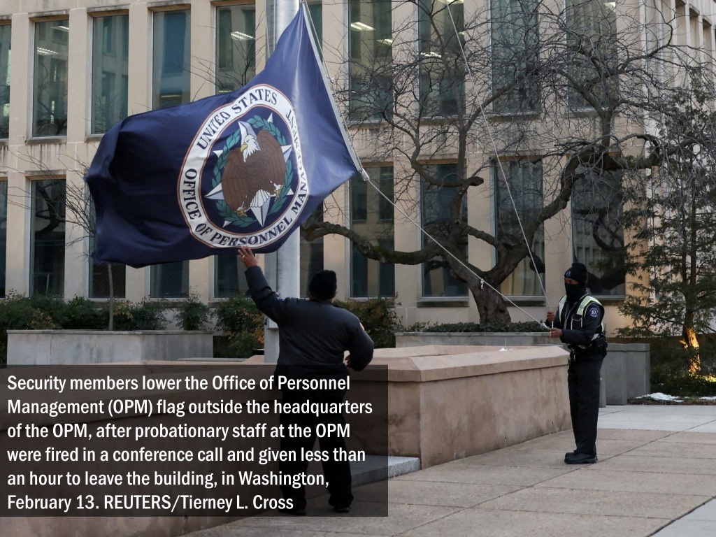Security members lower the Office of Personnel Management (OPM) flag outside the headquarters of the OPM, after probationary staff at the OPM were fired in a conference call and given less than an hour to leave the building, in Washington, February 13. REUTERS/Tierney L. Cross
