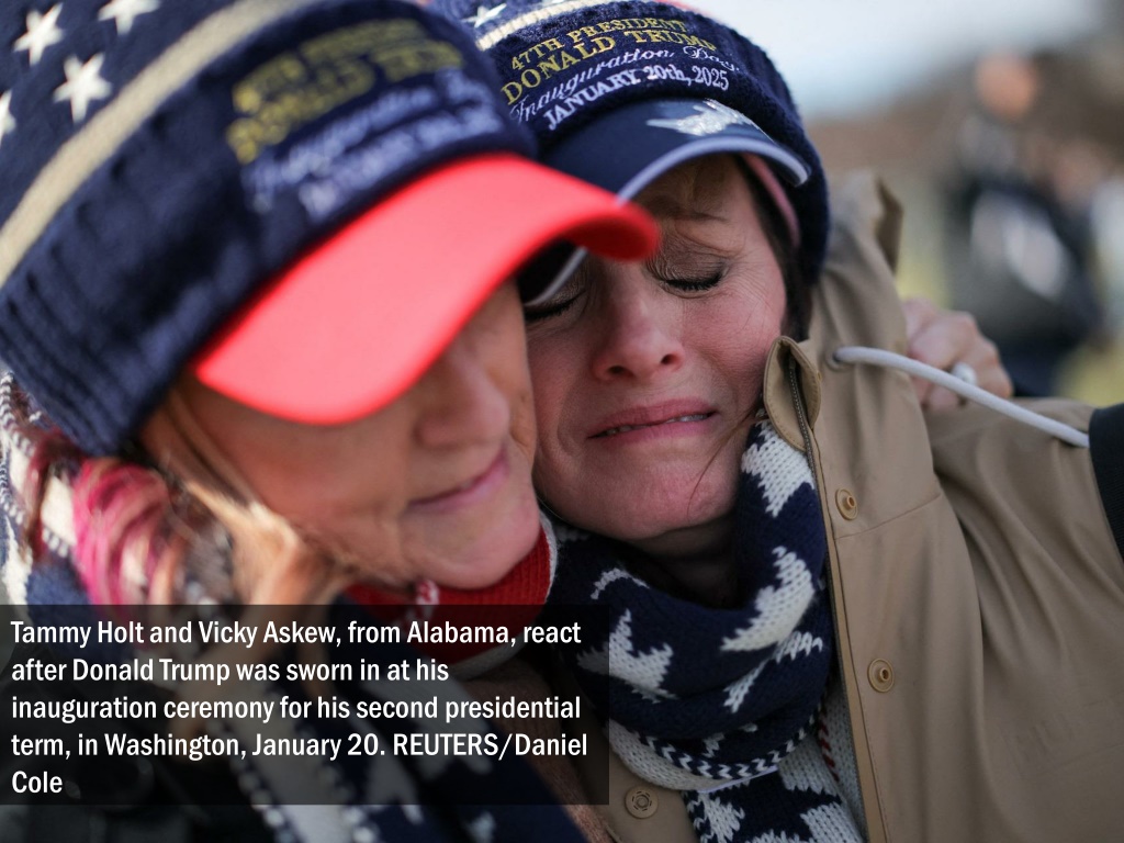 Tammy Holt and Vicky Askew, from Alabama, react after Donald Trump was sworn in at his inauguration ceremony for his second presidential term, in Washington, January 20. REUTERS/Daniel Cole