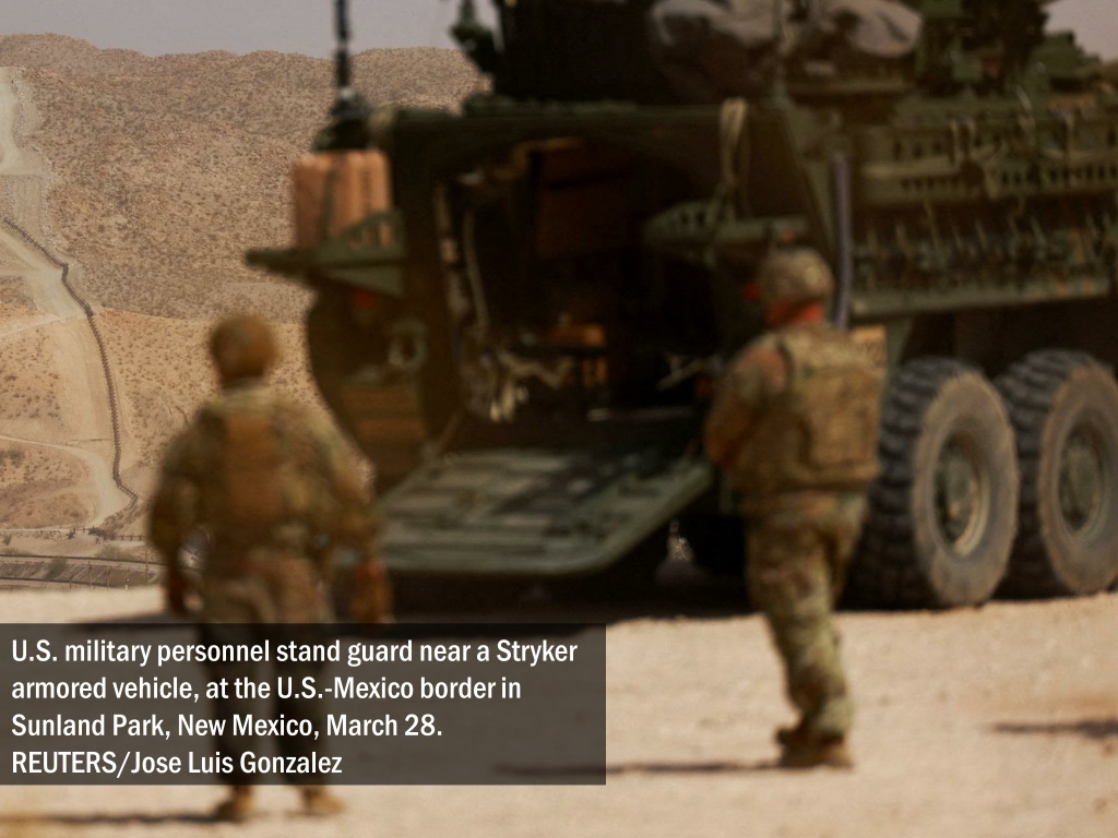 U.S. military personnel stand guard near a Stryker armored vehicle, at the U.S.-Mexico border in Sunland Park, New Mexico, March 28. REUTERS/Jose Luis Gonzalez