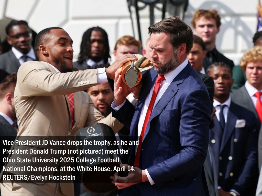 Vice President JD Vance drops the trophy, as he and President Donald Trump (not pictured) meet the Ohio State University 2025 College Football National Champions, at the White House, April 14. REUTERS/Evelyn Hockstein