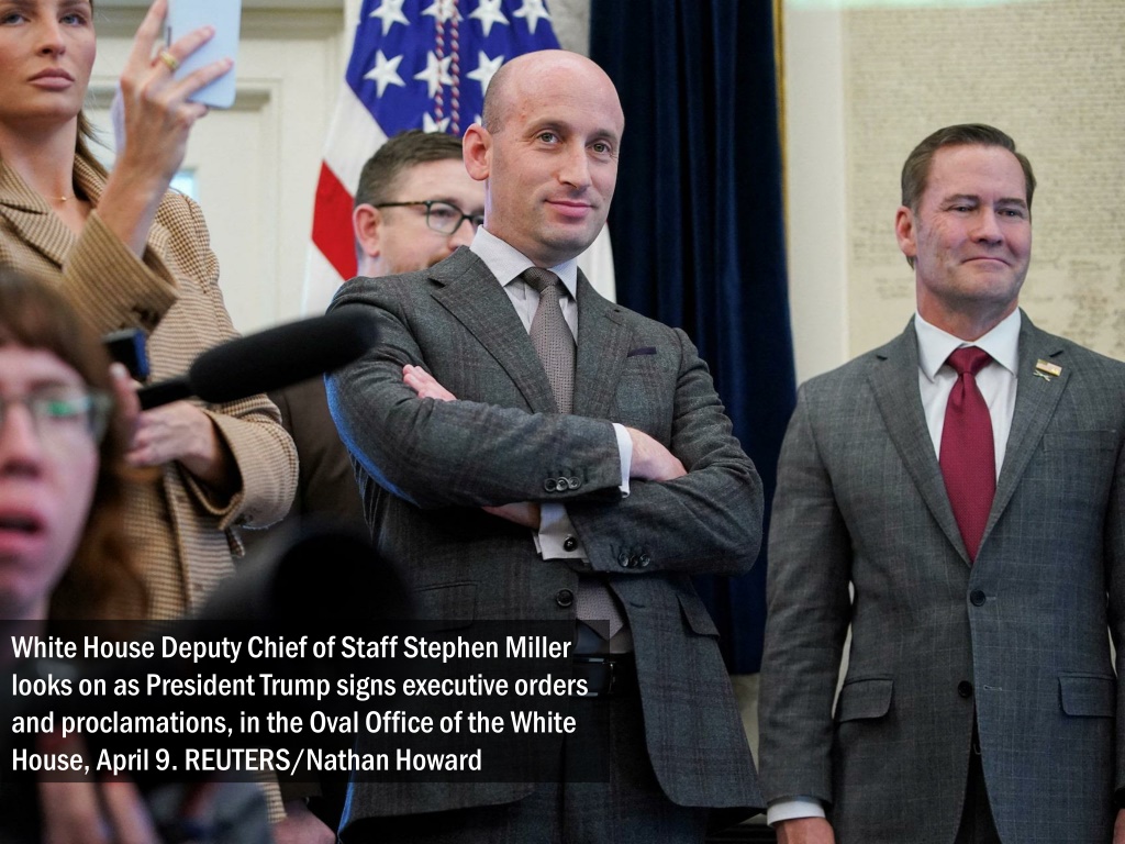 White House Deputy Chief of Staff Stephen Miller looks on as President Trump signs executive orders and proclamations, in the Oval Office of the White House, April 9. REUTERS/Nathan Howard