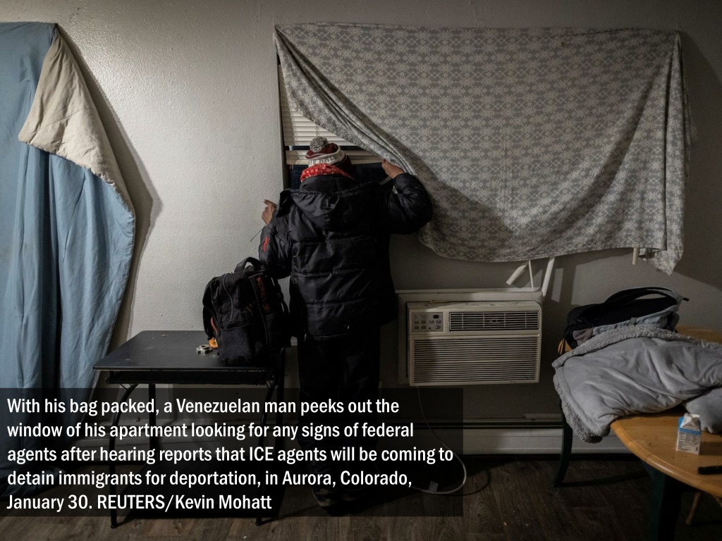 With his bag packed, a Venezuelan man peeks out the window of his apartment looking for any signs of federal agents after hearing reports that ICE agents will be coming to detain immigrants for deportation, in Aurora, Colorado, January 30. REUTERS/Kevin Mohatt