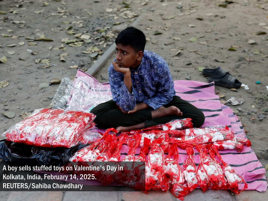 A boy sells stuffed toys on Valentine's Day in Kolkata, India, February 14, 2025. REUTERS/Sahiba Chawdhary