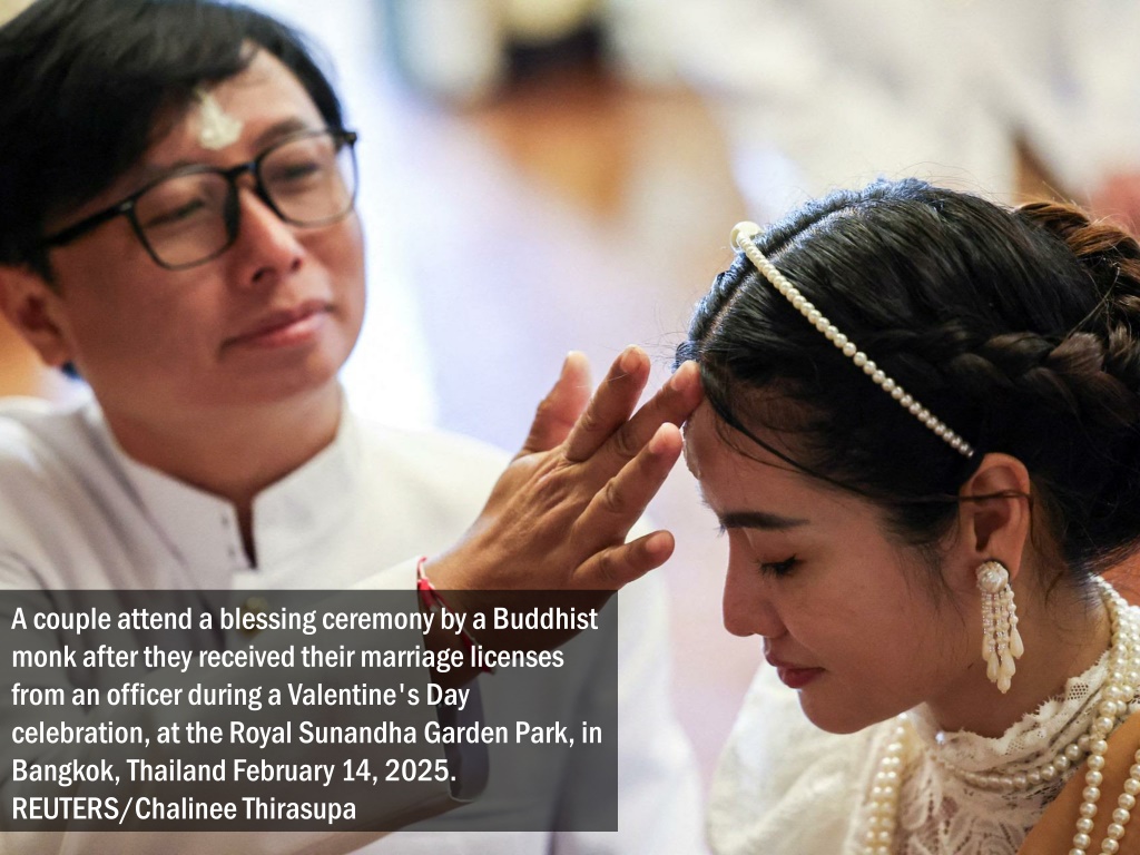A couple attend a blessing ceremony by a Buddhist monk after they received their marriage licenses from an officer during a Valentine's Day celebration, at the Royal Sunandha Garden Park, in Bangkok, Thailand February 14, 2025. REUTERS/Chalinee Thirasupa