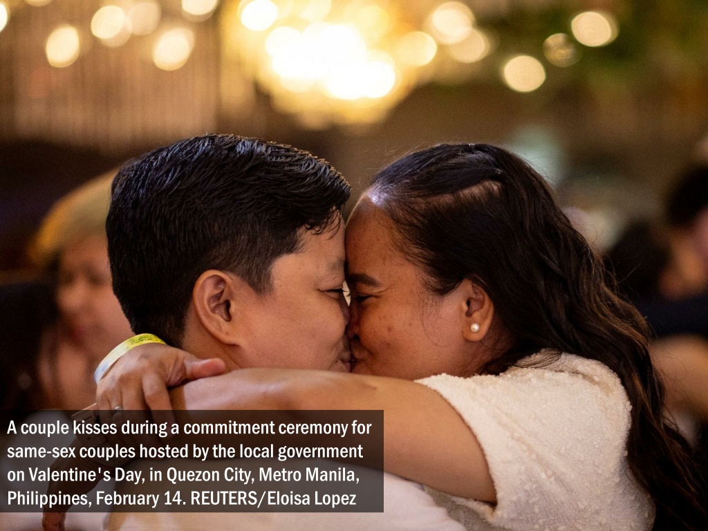 A couple kisses during a commitment ceremony for same-sex couples hosted by the local government on Valentine's Day, in Quezon City, Metro Manila, Philippines, February 14. REUTERS/Eloisa Lopez