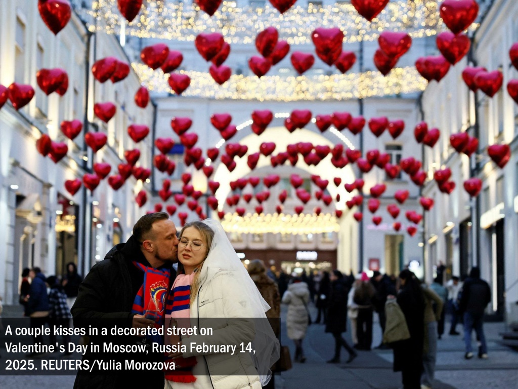 A couple kisses in a decorated street on Valentine's Day in Moscow, Russia February 14, 2025. REUTERS/Yulia Morozova