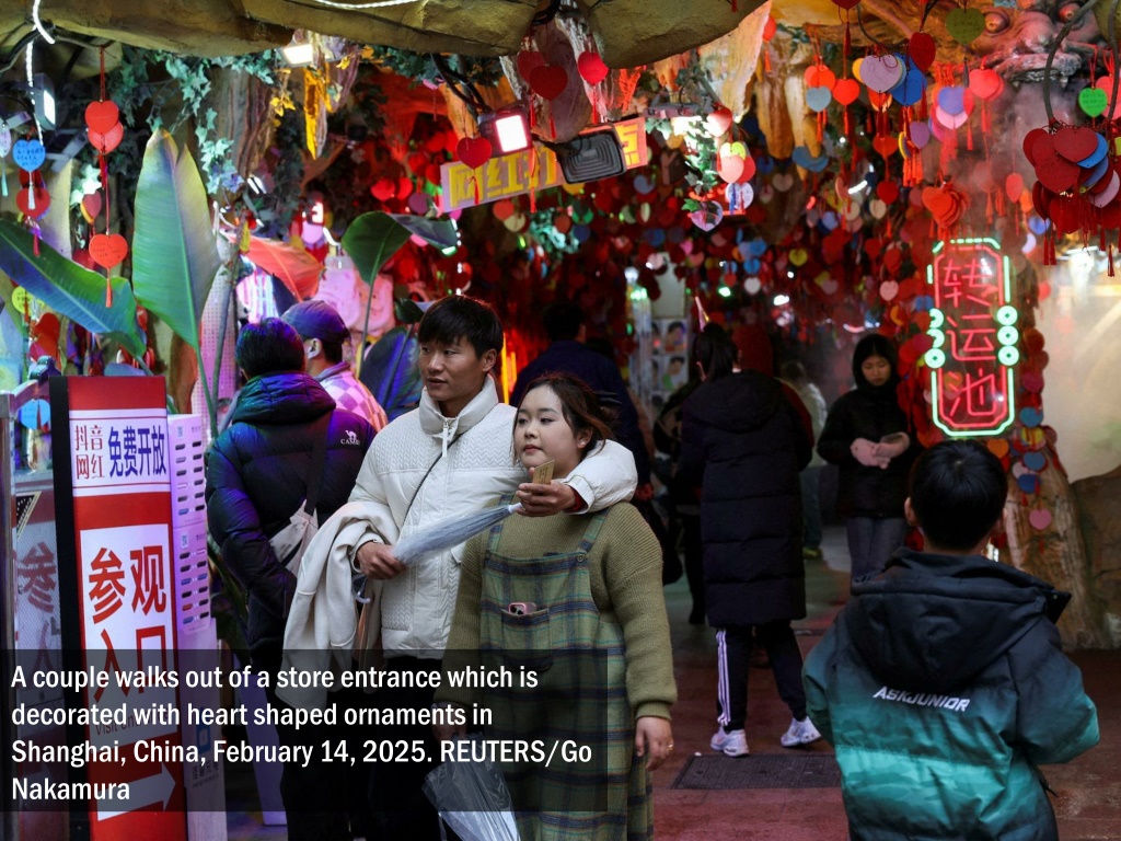A couple walks out of a store entrance which is decorated with heart shaped ornaments in Shanghai, China, February 14, 2025. REUTERS/Go Nakamura
