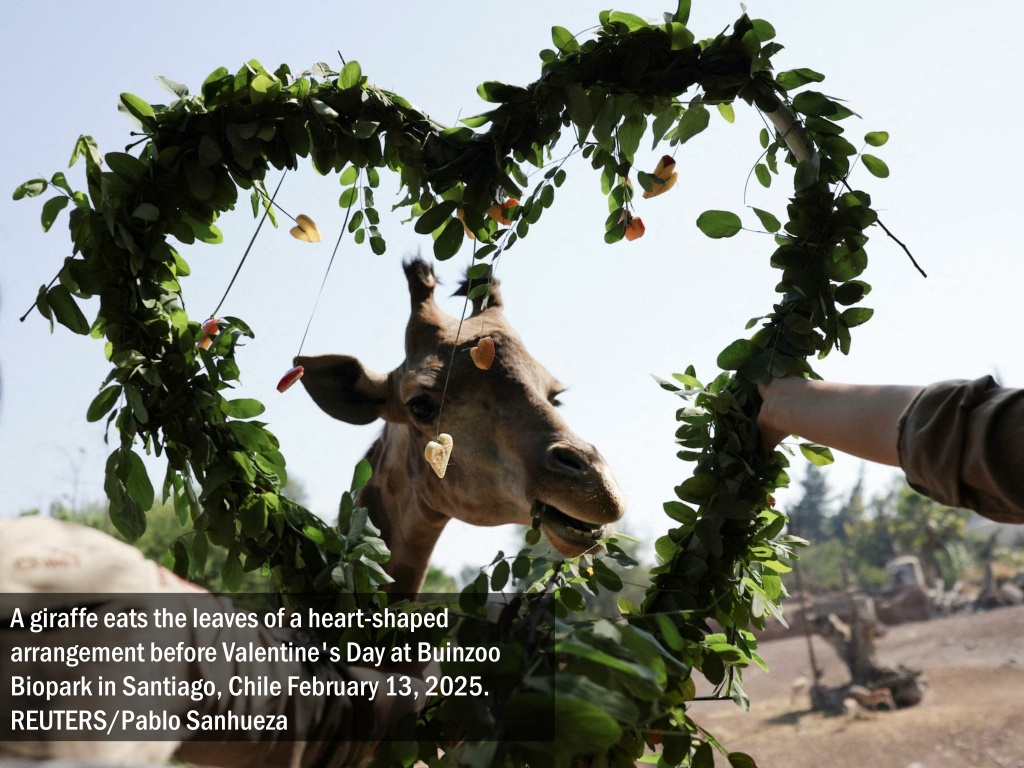 A giraffe eats the leaves of a heart-shaped arrangement before Valentine's Day at BuinzooBiopark in Santiago, Chile February 13, 2025. REUTERS/Pablo Sanhueza