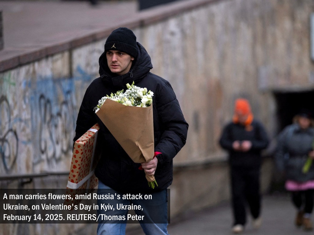 A man carries flowers, amid Russia's attack on Ukraine, on Valentine's Day in Kyiv, Ukraine, February 14, 2025. REUTERS/Thomas Peter