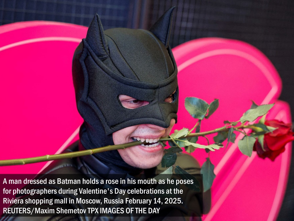 A man dressed as Batman holds a rose in his mouth as he poses for photographers during Valentine's Day celebrations at the Riviera shopping mall in Moscow, Russia February 14, 2025. REUTERS/Maxim Shemetov TPX IMAGES OF THE DAY