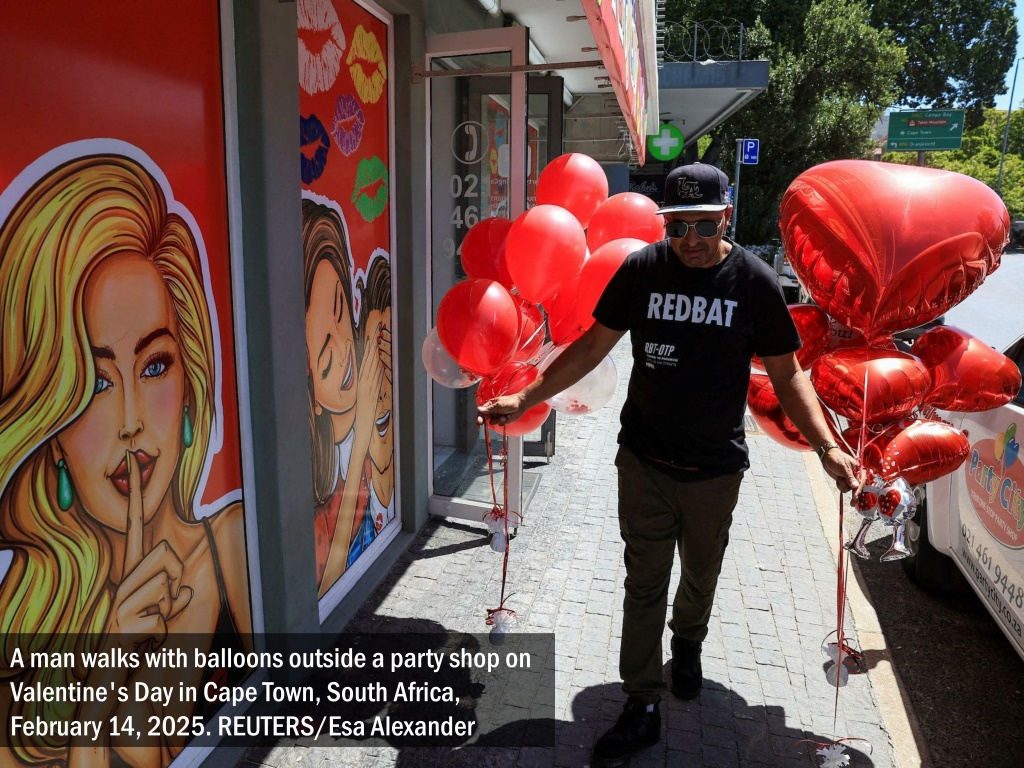A man walks with balloons outside a party shop on Valentine's Day in Cape Town, South Africa, February 14, 2025. REUTERS/Esa Alexander