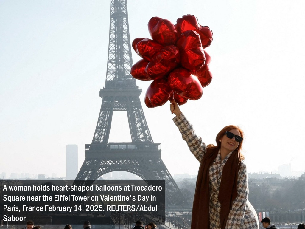 A woman holds heart-shaped balloons at Trocadero Square near the Eiffel Tower on Valentine's Day in Paris, France February 14, 2025. REUTERS/Abdul Saboor