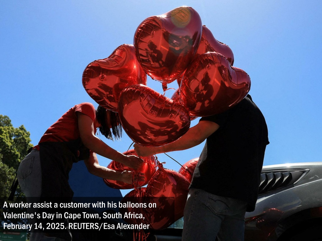 A worker assist a customer with his balloons on Valentine's Day in Cape Town, South Africa, February 14, 2025. REUTERS/Esa Alexander