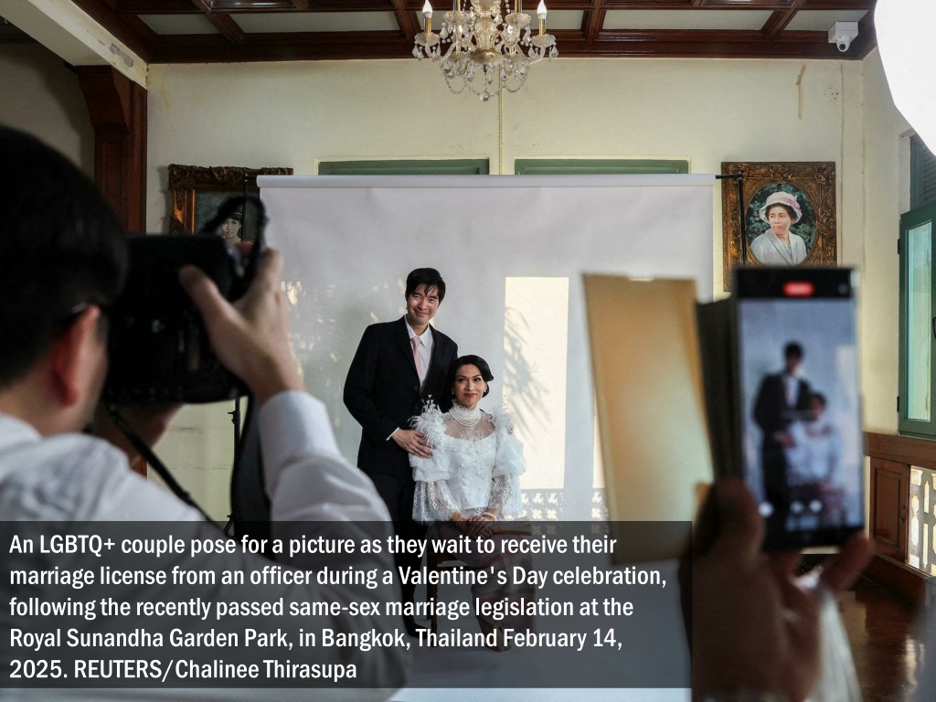 An LGBTQ+ couple pose for a picture as they wait to receive their marriage license from an officer during a Valentine's Day celebration, following the recently passed same-sex marriage legislation at the Royal Sunandha Garden Park, in Bangkok, Thailand February 14, 2025. REUTERS/ChalineeThirasupa