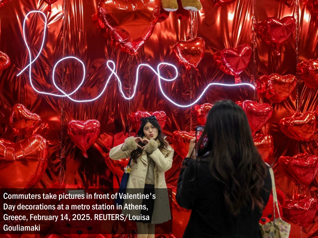 Commuters take pictures in front of Valentine's Day decorations at a metro station in Athens, Greece, February 14, 2025. REUTERS/Louisa Gouliamaki