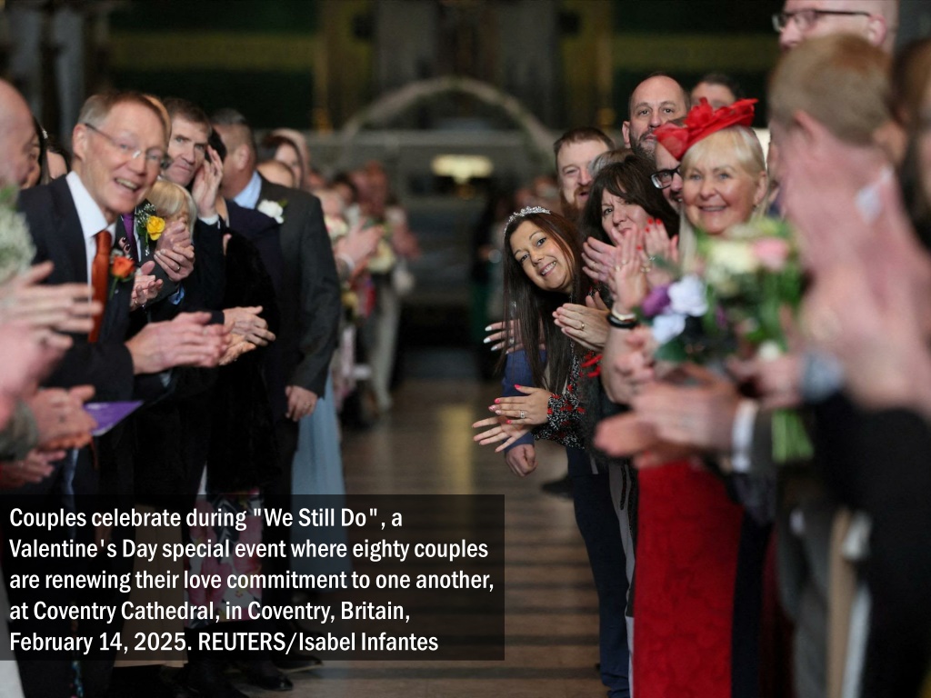 Couples celebrate during "We Still Do", a Valentine's Day special event where eighty couples are renewing their love commitment to one another, at Coventry Cathedral, in Coventry, Britain, February 14, 2025. REUTERS/Isabel Infantes