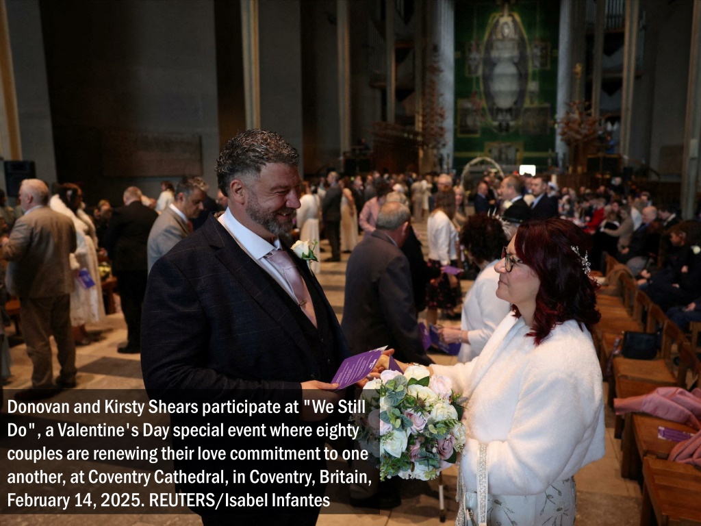 Donovan and Kirsty Shears participate at "We Still Do", a Valentine's Day special event where eighty couples are renewing their love commitment to one another, at Coventry Cathedral, in Coventry, Britain, February 14, 2025. REUTERS/Isabel Infantes