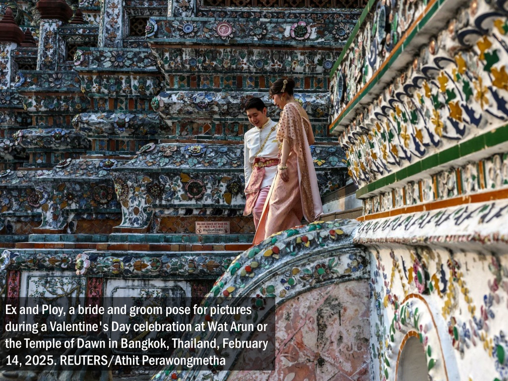 Ex and Ploy, a bride and groom pose for pictures during a Valentine's Day celebration at Wat Arun or the Temple of Dawn in Bangkok, Thailand, February 14, 2025. REUTERS/AthitPerawongmetha