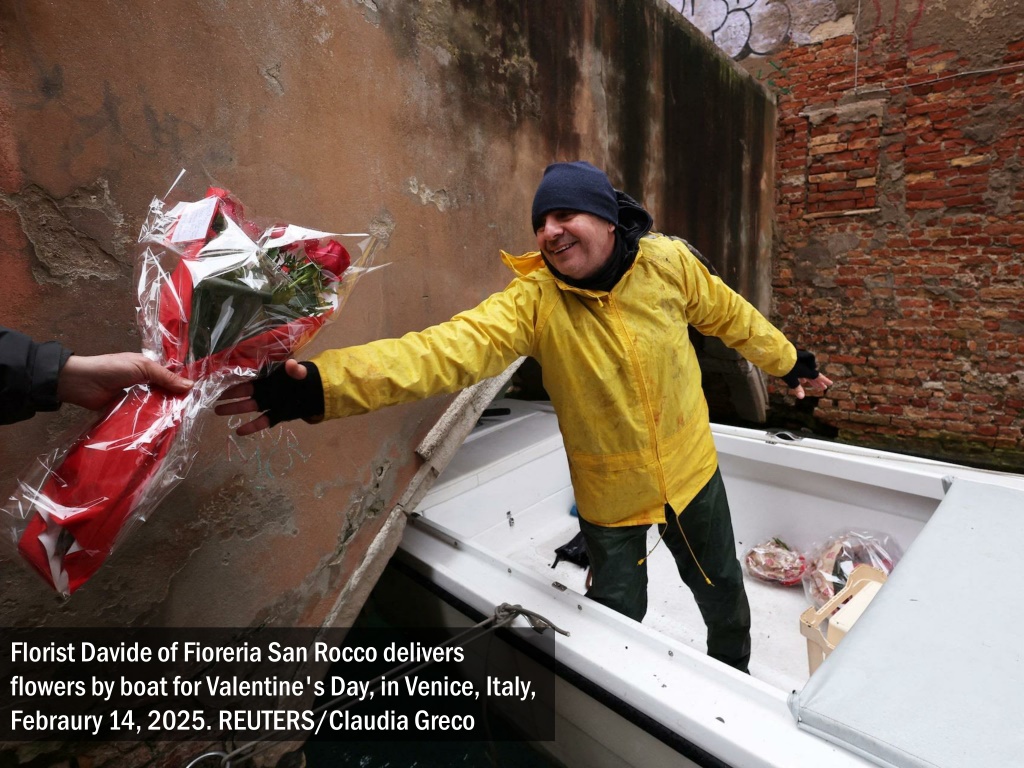 Florist Davide of Fioreria San Rocco delivers flowers by boat for Valentine's Day, in Venice, Italy, Febraury 14, 2025. REUTERS/Claudia Greco