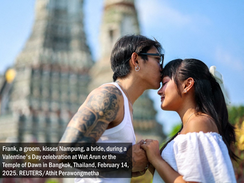 Frank, a groom, kisses Nampung, a bride, during a Valentine's Day celebration at Wat Arun or the Temple of Dawn in Bangkok, Thailand, February 14, 2025. REUTERS/AthitPerawongmetha