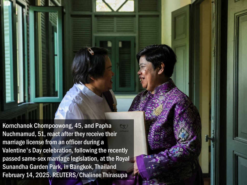 KornchanokChompoowong, 45, and PaphaNuchmamud, 51, react after they receive their marriage license from an officer during a Valentine's Day celebration, following the recently passed same-sex marriage legislation, at the Royal Sunandha Garden Park, in Bangkok, Thailand February 14, 2025. REUTERS/ChalineeThirasupa