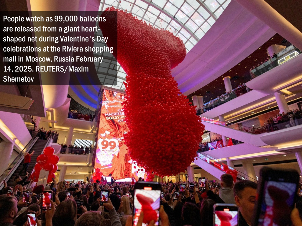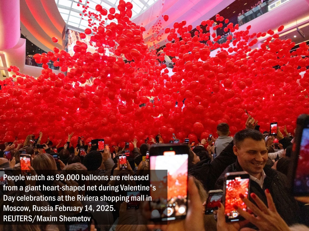 People watch as 99,000 balloons are released from a giant heart-shaped net during Valentine's Day celebrations at the Riviera shopping mall in Moscow, Russia February 14, 2025. REUTERS/Maxim Shemetov