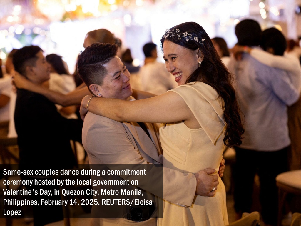 Same-sex couples dance during a commitment ceremony hosted by the local government on Valentine's Day, in Quezon City, Metro Manila, Philippines, February 14, 2025. REUTERS/Eloisa Lopez