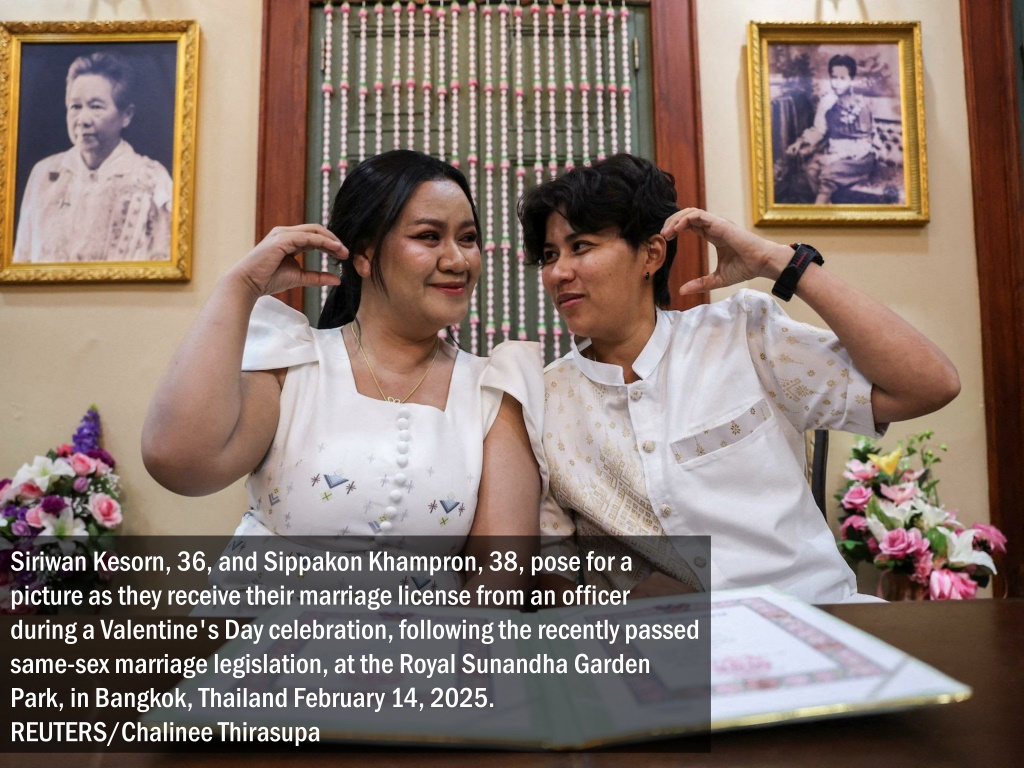 SiriwanKesorn, 36, and SippakonKhampron, 38, pose for a picture as they receive their marriage license from an officer during a Valentine's Day celebration, following the recently passed same-sex marriage legislation, at the Royal Sunandha Garden Park, in Bangkok, Thailand February 14, 2025. REUTERS/ChalineeThirasupa