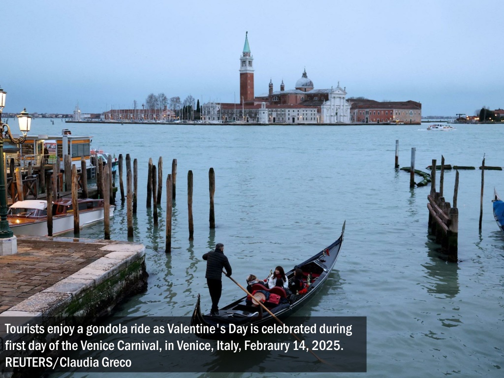 Tourists enjoy a gondola ride as Valentine's Day is celebrated during first day of the Venice Carnival, in Venice, Italy, Febraury 14, 2025. REUTERS/Claudia Greco