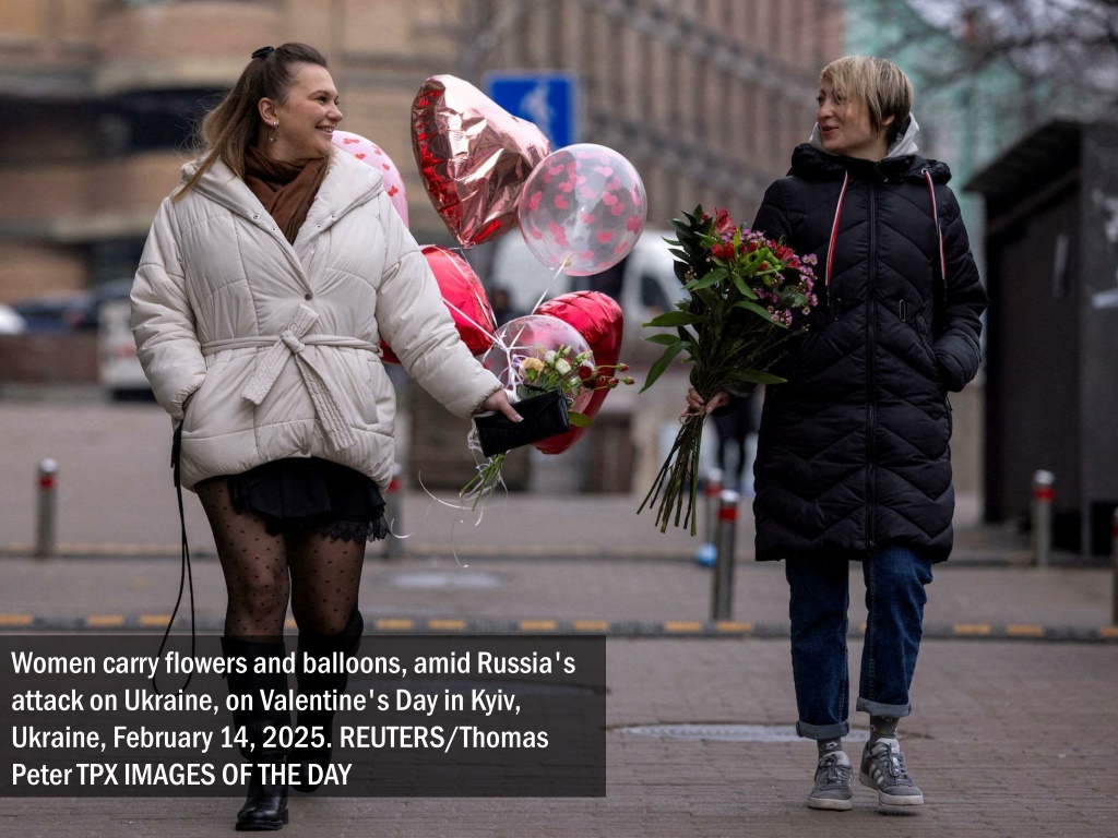 Women carry flowers and balloons, amid Russia's attack on Ukraine, on Valentine's Day in Kyiv, Ukraine, February 14, 2025. REUTERS/Thomas Peter TPX IMAGES OF THE DAY