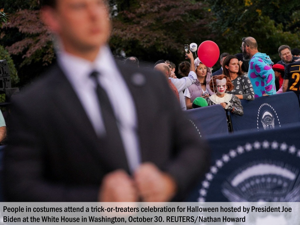 People in costumes attend a trick-or-treaters celebration for Halloween hosted by President Joe Biden at the White House in Washington, October 30. REUTERS/Nathan Howard