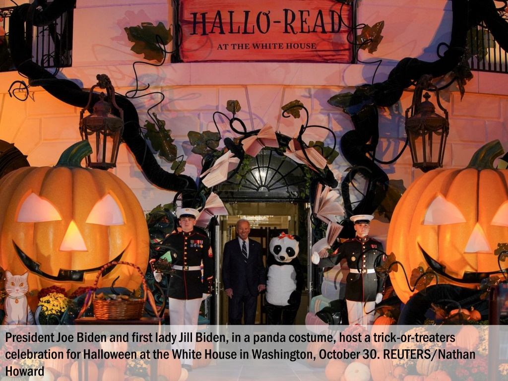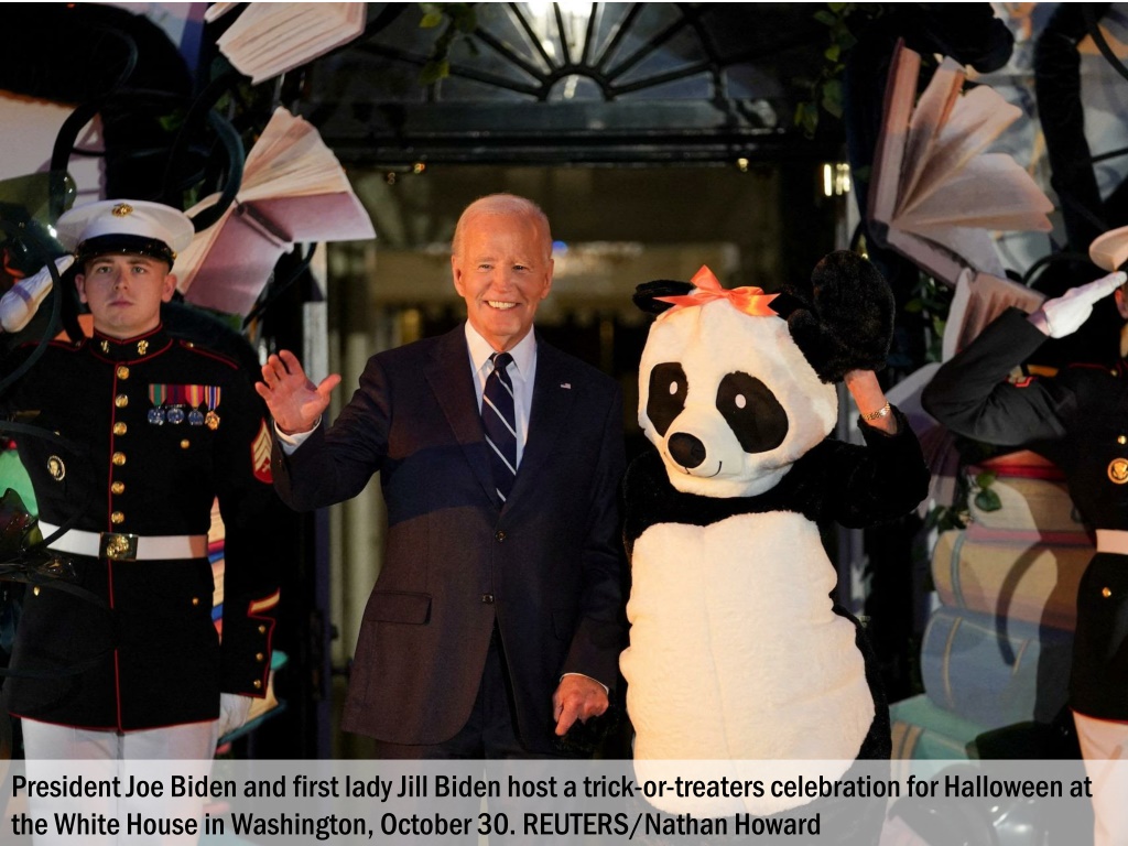 President Joe Biden and first lady Jill Biden, in a panda costume, host a trick-or-treaters celebration for Halloween at the White House in Washington, October 30. REUTERS/Nathan Howard