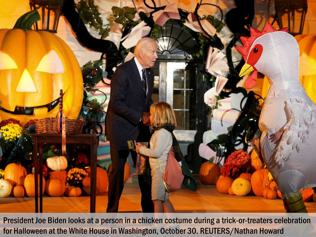 President Joe Biden looks at a person in a chicken costume during a trick-or-treaters celebration for Halloween at the White House in Washington, October 30. REUTERS/Nathan Howard