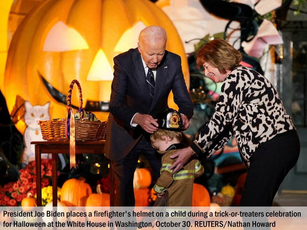 President Joe Biden places a firefighter's helmet on a child during a trick-or-treaters celebration for Halloween at the White House in Washington, October 30. REUTERS/Nathan Howard