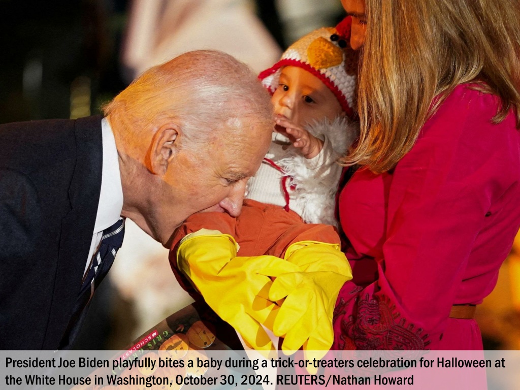 President Joe Biden playfully bites a baby during a trick-or-treaters celebration for Halloween at the White House in Washington, October 30, 2024. REUTERS/Nathan Howard