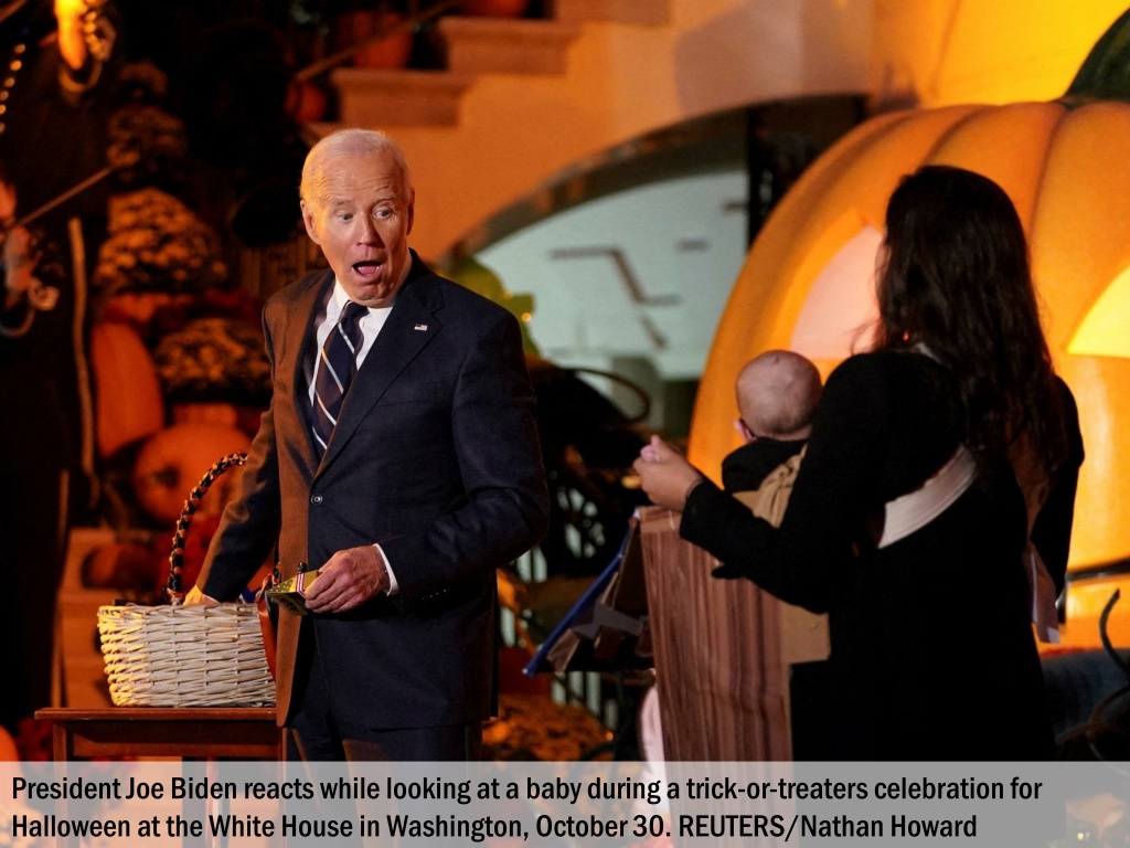 President Joe Biden reacts while looking at a baby during a trick-or-treaters celebration for Halloween at the White House in Washington, October 30. REUTERS/Nathan Howard